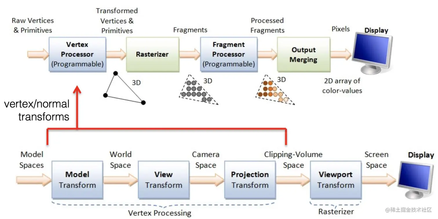 坐标变换主要发生在顶点处理阶段,外加光栅化进行一次视口变换