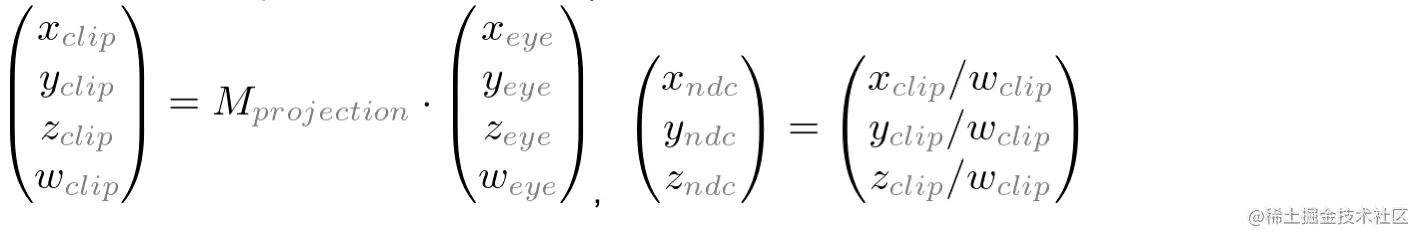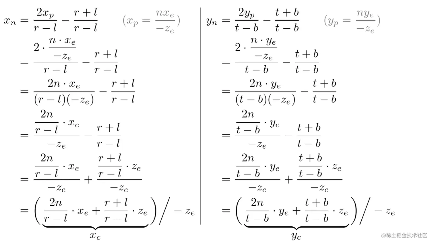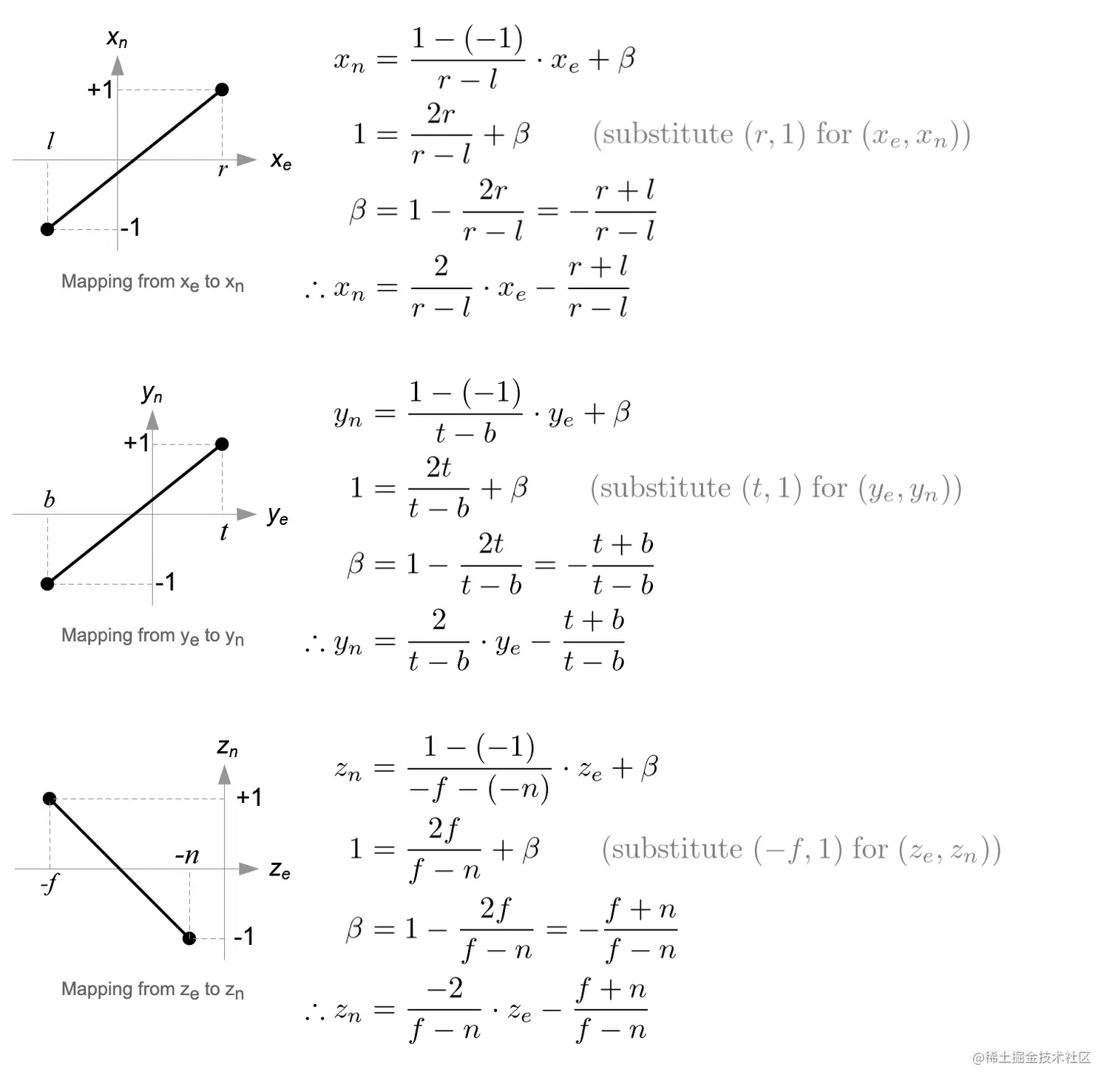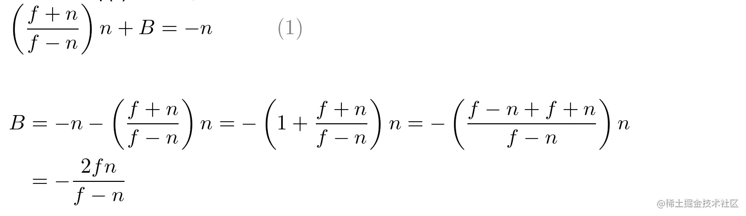 整个过程按 eye space ==> clip space ==> ndc space流程建立方程,基于齐次坐标和NDC坐标范围约束建立方程。