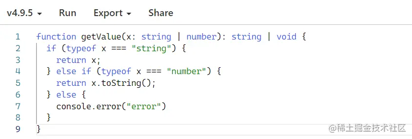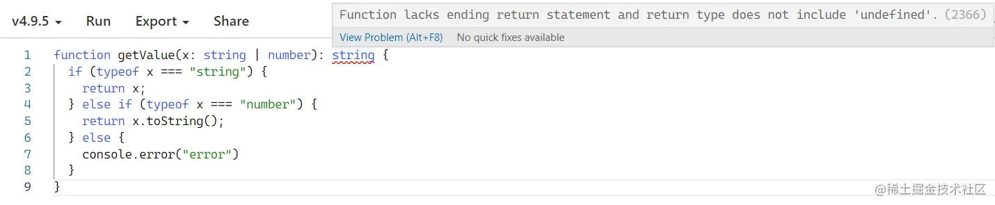 void表示该函数没有返回值,所以string | void1兼容了所有的分支情况,但是这里非常不推荐这么做,正确的做法还是assertNever那个例子 - 原因是如果我们对这个函数按照参数类型正确传递参数,是不可能走到最后一个分支的,所以也就没必要单独在