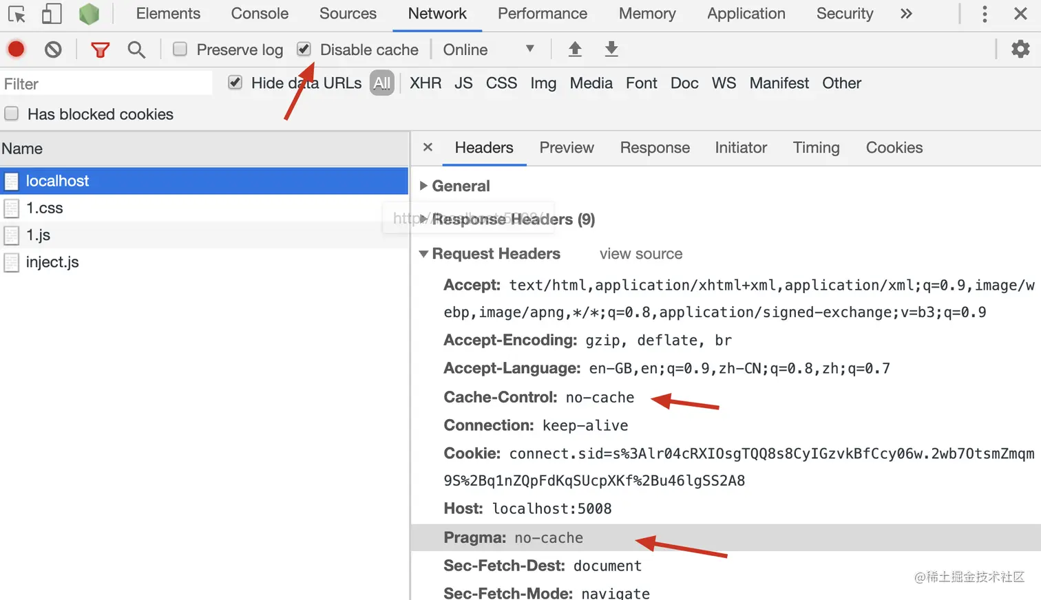 在Chrome浏览器中调试时,如果勾选了Disable cache,则发送的请求中会附带该信息