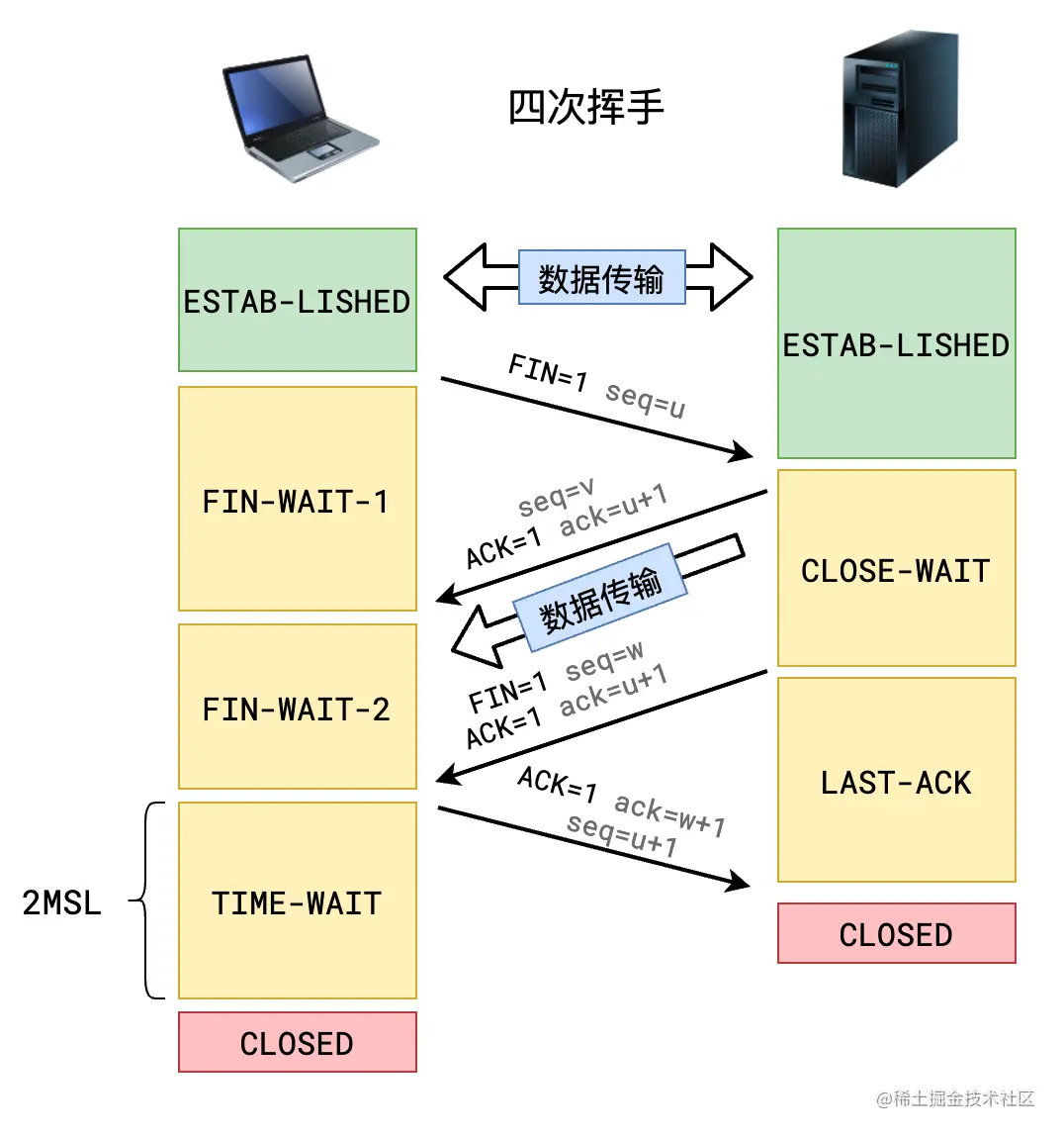 - Client 收到 FIN 包后向 Server 发送 ACK 包,然后进入 TIME_WAIT 状态,接着等待足够长的时间(2MSL)以确保 Server 接收到 ACK 包,最后回到 CLOSED 状态,释放网络资源。