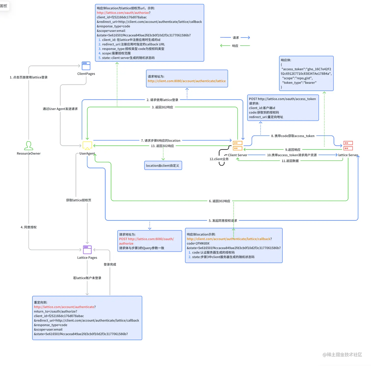 - scope(OPTIONAL):请求的授权作用域。scope的值不得包含资源拥有者最初未授予Client的作用域,若果省略scope,那么默认其值为资源拥有者最初授予Client的作用域。