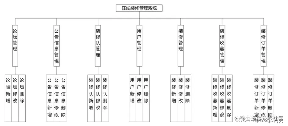 在前面分析的管理员功能的基础上,进行接下来的设计工作,最终展示设计的管理员结构图。管理员增删改查装修样板
