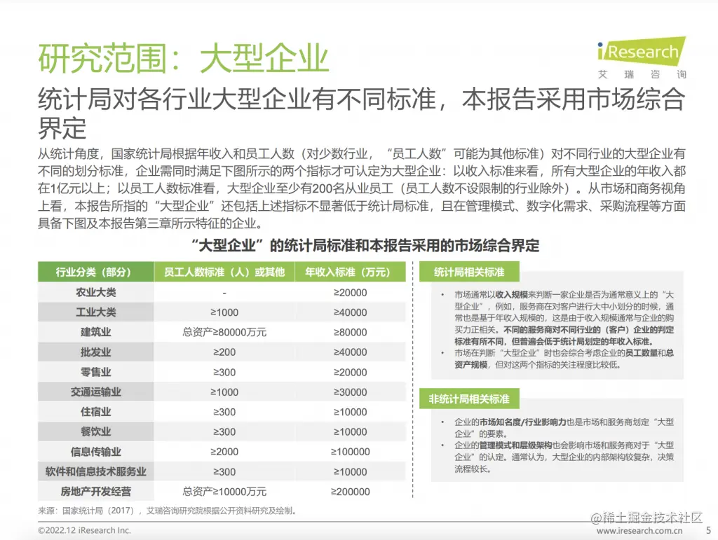经艾瑞咨询核算,2021年中国大型企业数字化支出规模约为2.8万亿元,估算2021-2026年中国大型企业数字化支出平均复合增速将达到12.3%。受疫情和宏观经济增长状况影响,2020和2022年大型企业数字化支出增速有所波动,预计2023年市场景气度将有所恢复。整体来看,由于大型企业数字化转型需求具备相对刚性,且大型企业自身扛风险能力较强,市场增速整体平稳。