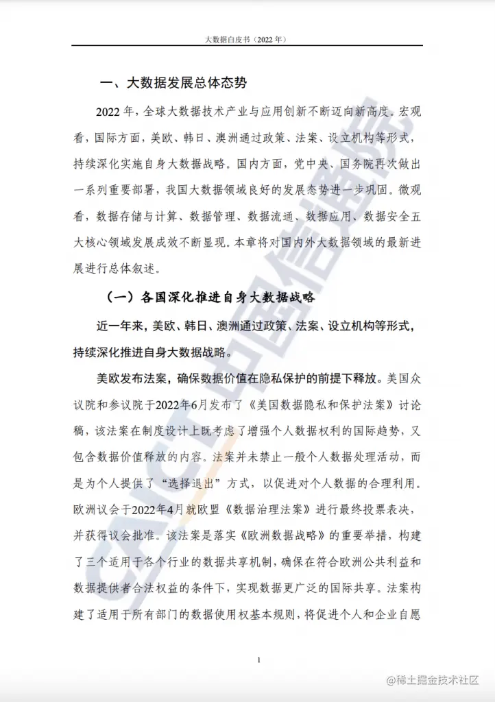 2022年,全球大数据技术产业与应用创新不断迈向新高度。宏观看,国际方面,美欧、韩日、澳洲通过政策、法案、设立机构等形式,持续深化实施自身大数据战略。国内方面,党中央、国务院再次做出一系列重要部署,我国大数据领域良好的发展态势进一步巩固。微观看,数据存储与计算、数据管理、数据流通、数据应用、数据安全五大核心领域均伴随相关政策、技术、产业、应用的不断演进,发展目标进一步明确和丰富,发展成效不断显现。