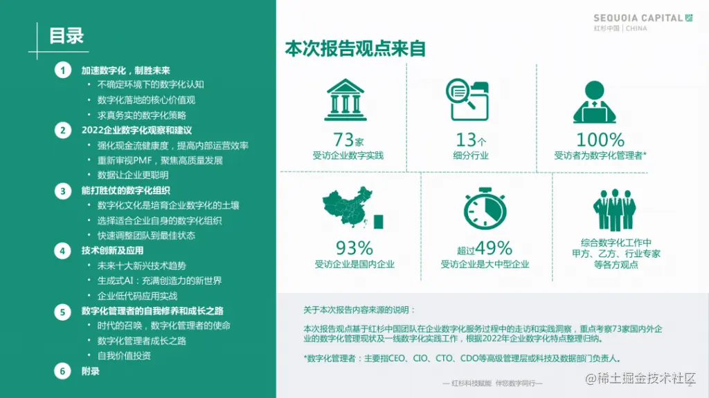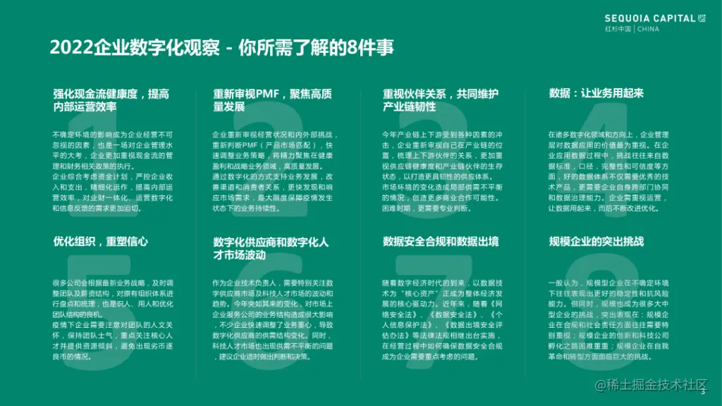 在降本、增收、提效的多重目标面前,越来越多的企业选择将数字化融入价值观,开展数字化实践,全行业已经进入数字化全面发展的新时期。数字化转型不但帮助企业解决实际运营中的难点痛点,而且结合企业实际业务形成新产品、新业态、新模式,助力企业多元化经营、跨界经营,增强企业核心竞争力。当企业的数字化升级、转型成为了共识,下一个问题摆上台面,如何成功将数字化战略落地?红杉中国首次发起面向国内广泛行业的CIO(首席信息官)群体调研,并发布了一份《企业数字化年度指南》。