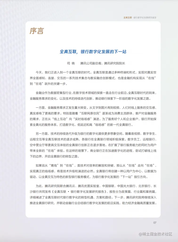 《报告》首提“全真银行”,全景呈现了在数实融合的趋势下,银行在打破线上线下的边界,推进数字化、全真化过程中的探索路径和前沿洞察。全真银行是银行通过布局数字孪生、云原生等技术,将物理世界与数字世界建立泛在连接,从而为客户提供沉浸式、个性化金融服务体验的新模式。数字员工、远程银行、空中营业厅等创新,是全真银行的典型应用。