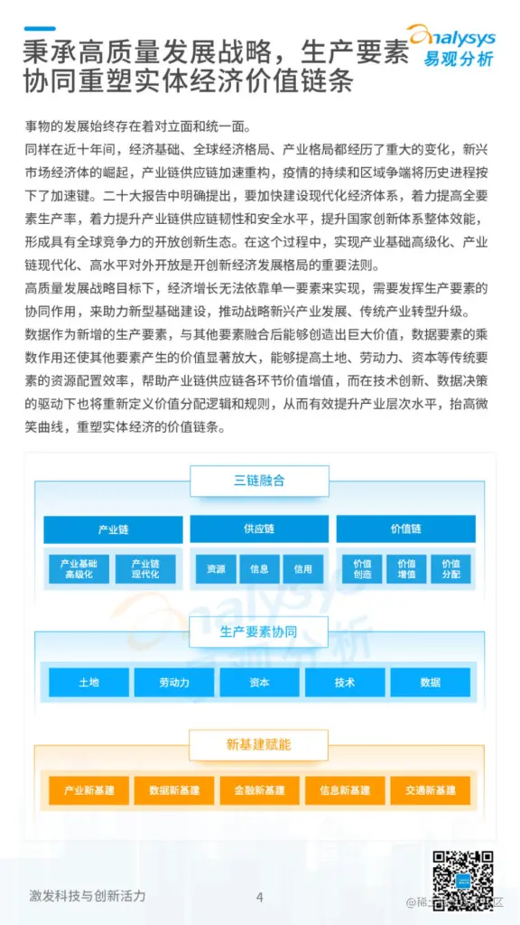 2023年,实体经济地位将愈发重要,探索数字经济与实体经济有机融合的方向,将充分体现数字技术对实体产业的赋能作用,推动实体产业结构升级和价值释放。高质量发展战略目标下,经济增长无法依靠单一要素来实现,需要发挥生产要素的协同作用,来助力新型基础建设,推动战略新兴产业发展、传统产业转型升级。而数据作为新增生产要素,与土地、劳动力、资本等传统要素融合后能够提高资源配置效率,帮助产业链供应链各环节价值增值,在技术创新、数据决策驱动下也将重新定义价值分配逻辑和规则,从而有效提升产业层次水平,重塑实体经济价值链条。