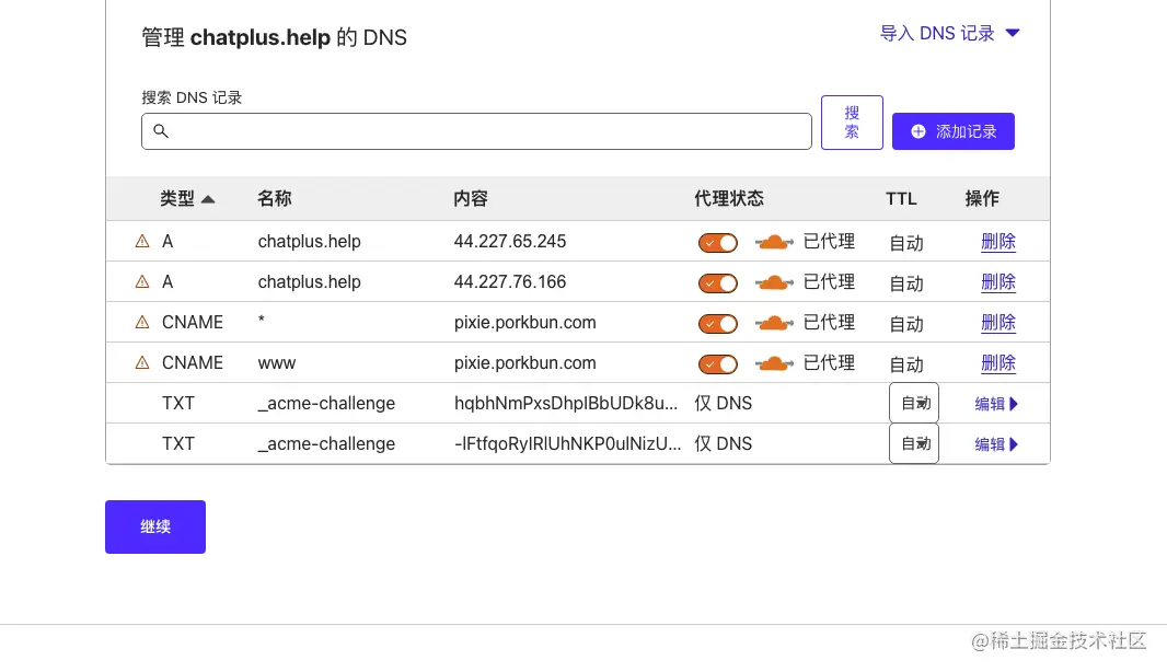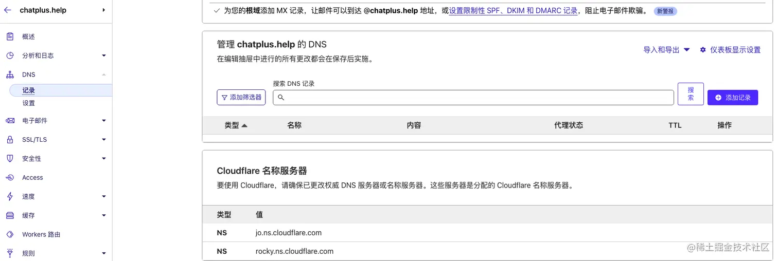 因为前面已经把域名的ns切换到cloudflare了,所以他会自动添加dns解析,无需手动操作