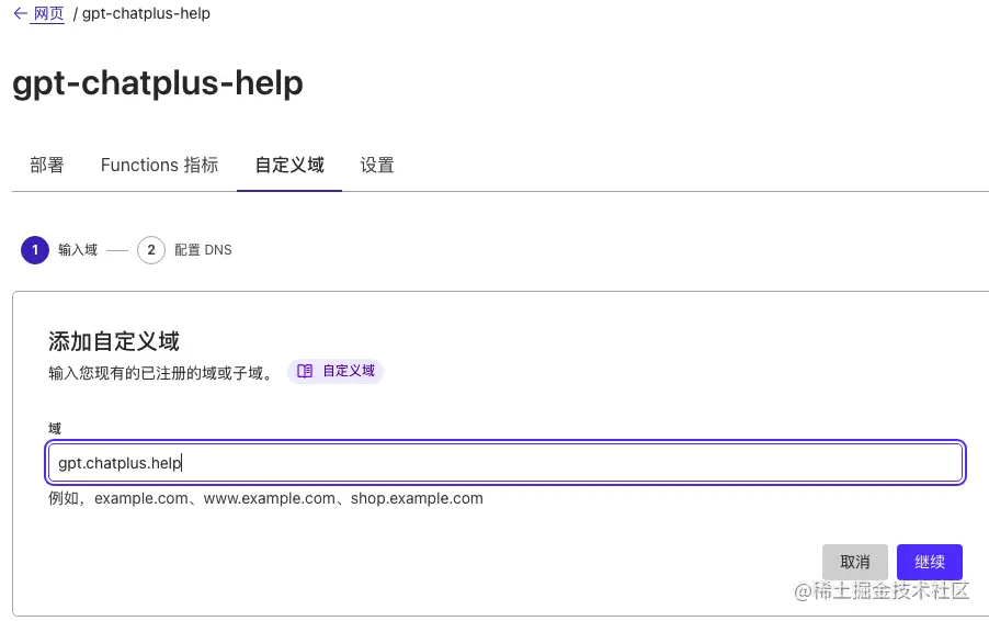 进度Page详情页,点击自定义域,一步步根据系统指引操作,输入自己的域名进行绑定。
