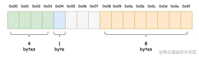 - 字段B 8字节:下标4-7,对8都不能整除,则填充空白,下标8可以整除,所以下标8-15 8个字节为字段B的存储使用;