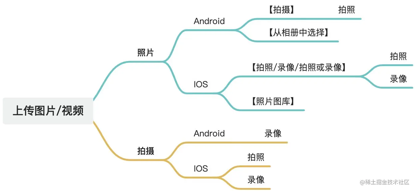 accept="video/xxx",即仅有视频格式情况下,Android点击原生【拍摄】唤起相机是录像功能;accept="image/xxx[,video/xxx]",即仅有图片格式或者图片加视频格式情况下,Android点击原生【拍摄】唤起相机都是照相功能;- Android点击原生【从照片选择】唤起相册,若要想只筛选视频,最好使用