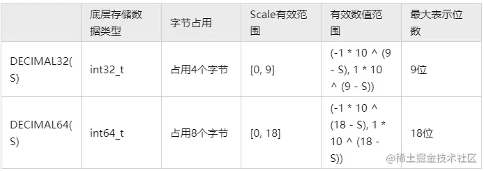 DECIMAL32/DECIMAL64 类型的数值范围如下表所示,其中,DECIMAL32(S) 和 DECIMAL64(S) 中的 S 表示保留的小数位数。