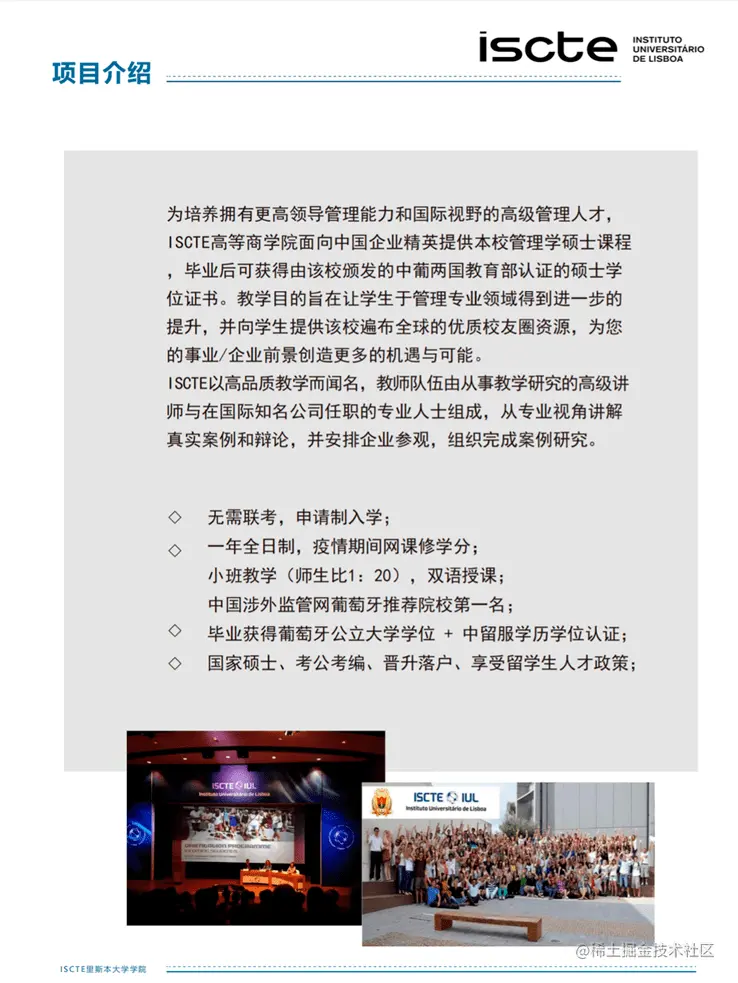 根据科仕捷葡萄牙里斯本大学学院留学项目介绍,该项目“无需联考,申请制入学;一年全日制,疫情期间网课修学分;小班教学,双语授课;毕业获得葡萄牙公立大学学位+中留服学历学位认证;国家硕士、考公考编、晋升落户,享受留学生人才政策。”