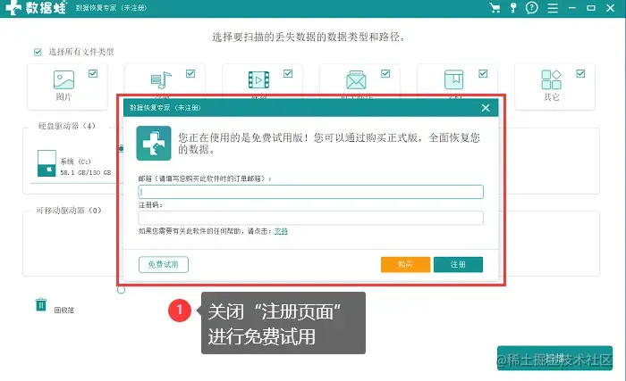 步骤1: 在官方网站上进行 【数据蛙恢复专家】 的下载,注意不要把软件安装在我们误删文件的磁盘中,避免数据被覆盖。先开始 【免费试用】 ,找到要恢复的回收站数据,再选择激活软件。