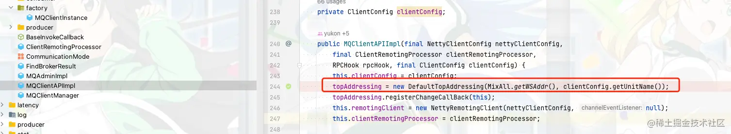 可以看到这里的的namesrvAddr地址的获取主要是通过clientConfig获取的,而clientConfig的构造就是通过DefaultMQProducer构造的(前面分析的),而我们就可以通过在启动Product的时候设置