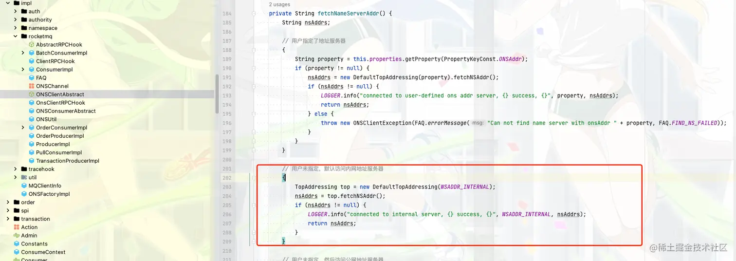 从上面我们可以确认最好的方式是通过http方式获取namesrvAddr地址,那么为什么我们使用阿里云的ons-clinet是这种方式呢