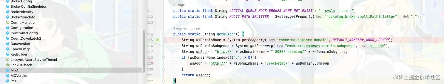 可以看到是通过MixAll.getWSAddr()的方法获取的,我们看看getWSAddr方法