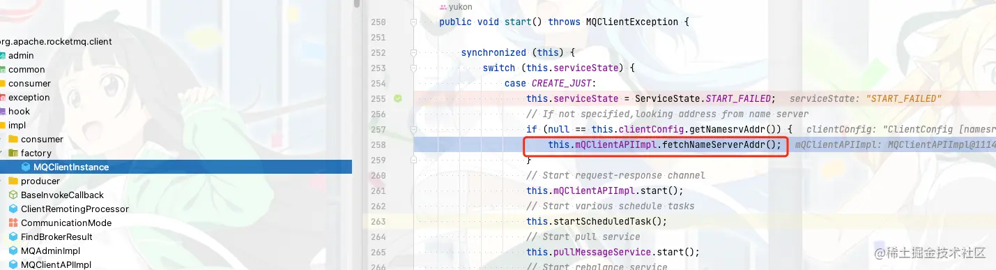 发现在product启动这里会去通过clientConfig获取namesrvAddr,如果我们之前的代码里面没有设置namesrvAddr的地址,那这里就会为空,然后就通过fetchNameServerAddr去获取namesrvAddr的地址