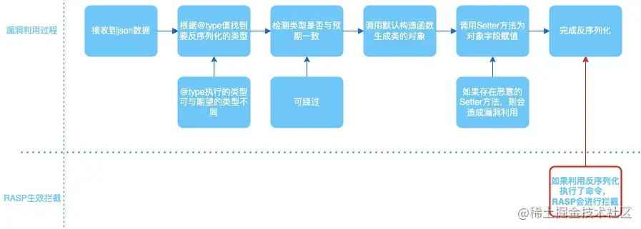 接下来,我们通过 fastjson 反序列化漏洞的攻击场景来演示 RASP应用安全的实际防护效果,fastjson 的反序列化过程主要如下: