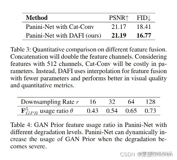 作者发现DAFI模块可以更好的保留GAN先验特征中的细节信息,而global condition guidance可以帮助DAFI更好的去fusion特征。当退化严重时,Panini-Net可以动态增加GAN-Prior的使用比例。