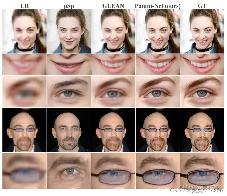 16xSR设定下的视觉对比图,可以看到PaniniNet很好的修复了退化图像的细节信息,保真度也非常不错。