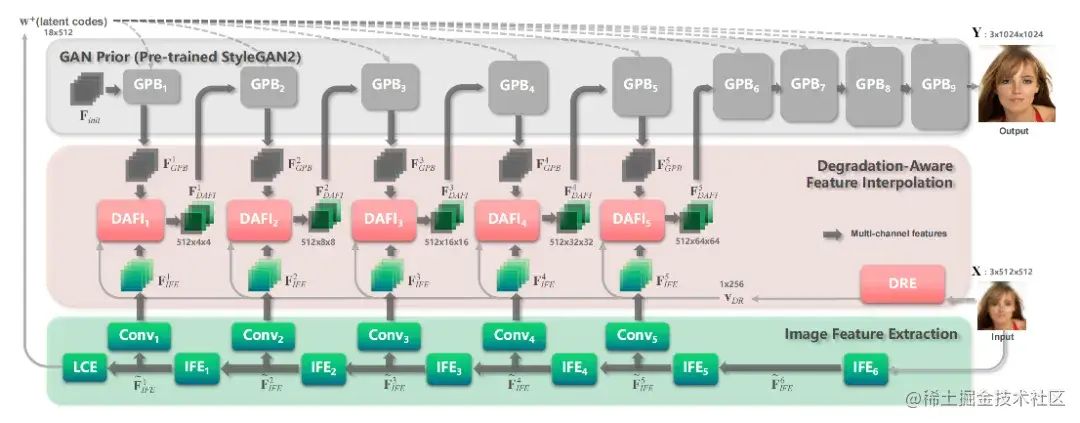 Panini-Net架构图。它由图像特征提取模块(Image Feature Extraction Module)、退化感知特征插值模块组成(DAFI) 模块,以预训练的 StyleGAN2 作为 GAN Prior 模块 (GPM)。给定退化的人脸图像作为输入,图像特征提取模块提取特征,并预测latent code,该latent code可以从 GPM 中粗略地获取类似的高质量人脸。然后,使用 DAFI 块逐步对特征做插值处理从而合并退化人脸图像的有效结构信息。预训练的退化表示编码器 (DRE) 将退化表示编码为向量,其可以被视为指导 DAFI 块进行恢复的全局条件。
