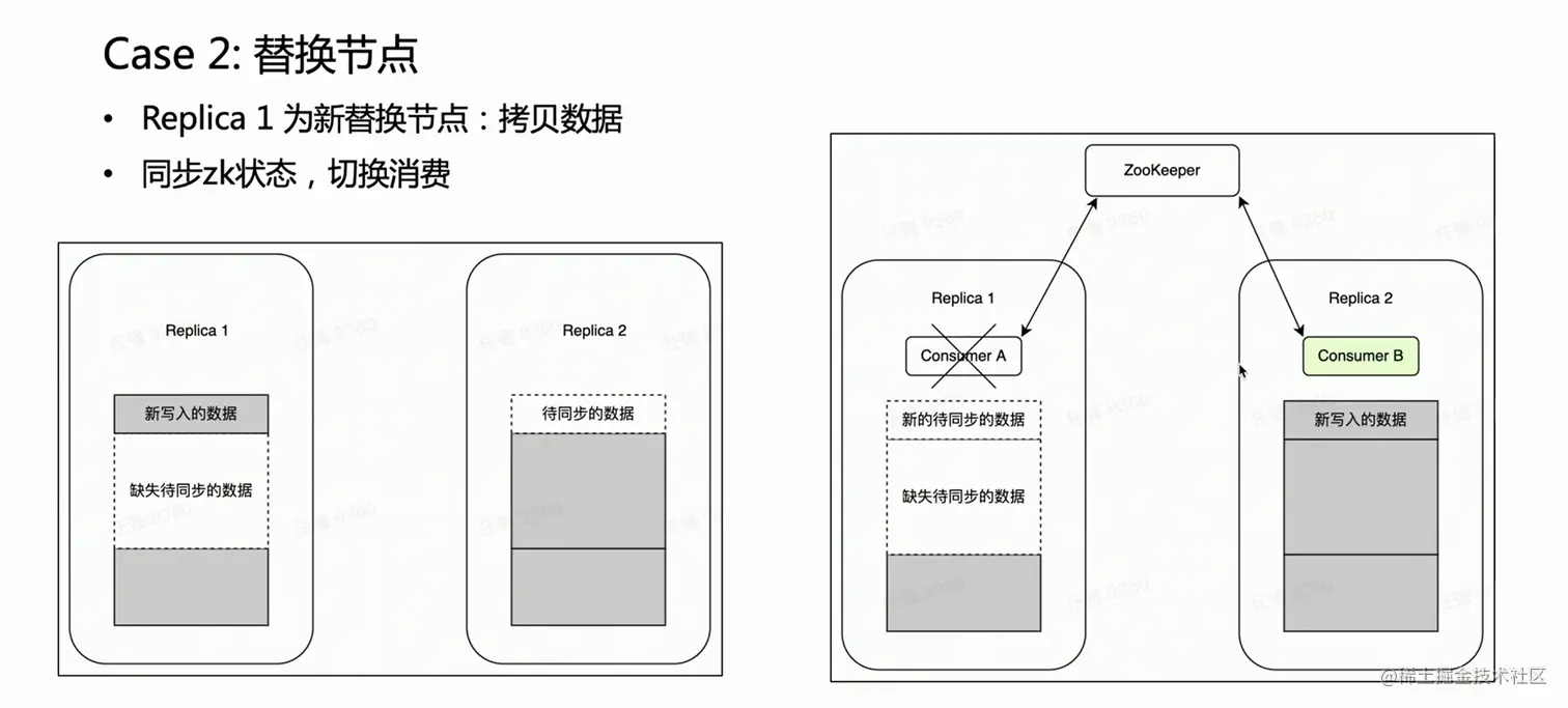 如果是一个多副本的集群,一个副本故障,另一个副本是完好的。我们很自然希望在节点替换阶段,Kafka 消费放在完好的副本 Replica 2 上,因为其上旧数据是完备的。这样 Replica 2 就始终是一个完备的数据集,可以正常对外提供服务。这一点 HaKafka 是可以保证的。HaKafka 选主的时候,如果确定有某一个节点在替换节点流程当中,会避免将其选为 Leader。