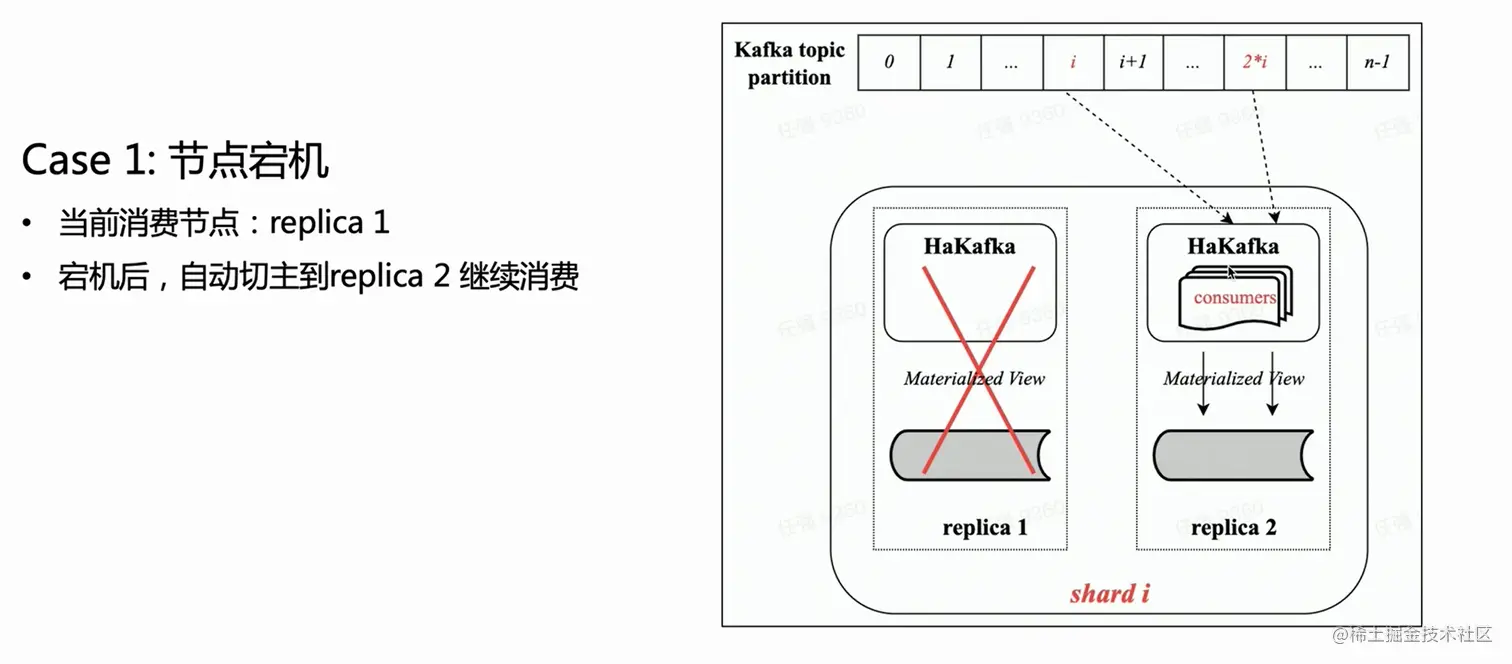 基于上图可见,假设有一个双副本的 Shard,每个副本都会有一张相同的 HaKafka 表处于 Ready 的状态。但是只有通过 ZK 选主成功的 leader 节点上,HaKafka 才会执行对应的消费流程。当这个 leader 节点宕机以后, 副本 Replica 2 会自动再被选为一个新的 Leader,继续消费,从而保证高可用。