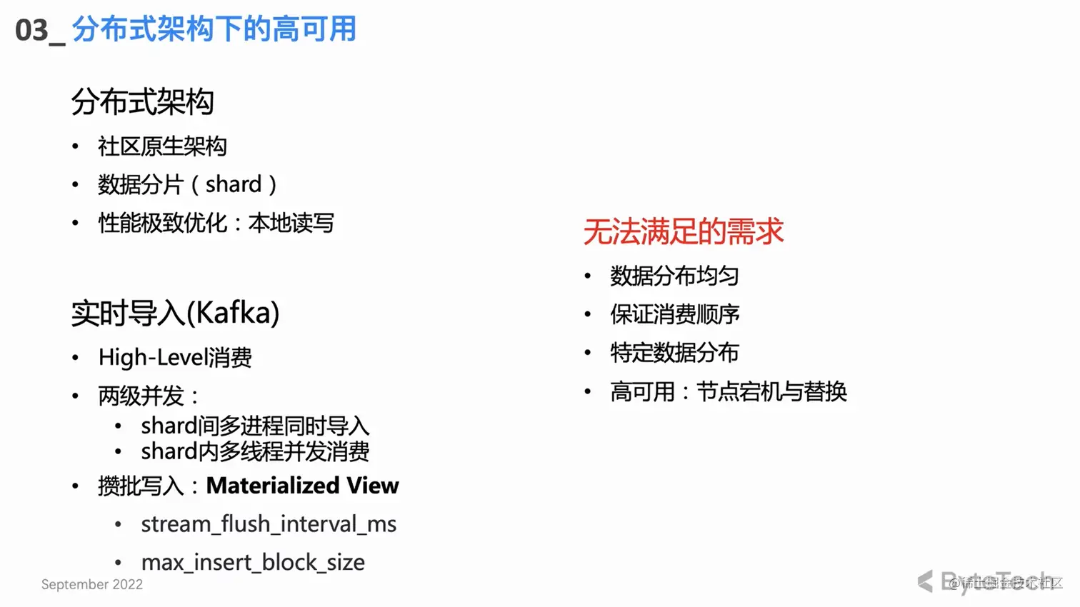 就分布式架构来谈,其实每个 Shard 内可能都会有多个副本,在每个副本上都可以做 HaKafka 表的创建。但是 ByteHouse 只会通过 ZK 选一个 Leader,让 Leader 来真正地执行消费流程,其他节点位于 Stand by 状态。当 Leader 节点不可用了,ZK 可以在秒级将 Leader 切到 Stand by 节点继续消费,从而实现一种高可用。