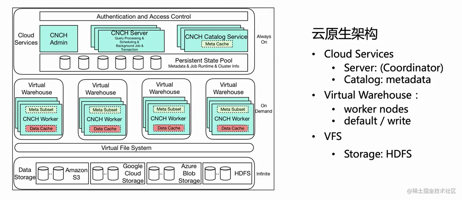 最底层是 VFS(数据存储),支持 HDFS、S3、aws 等云存储组件。