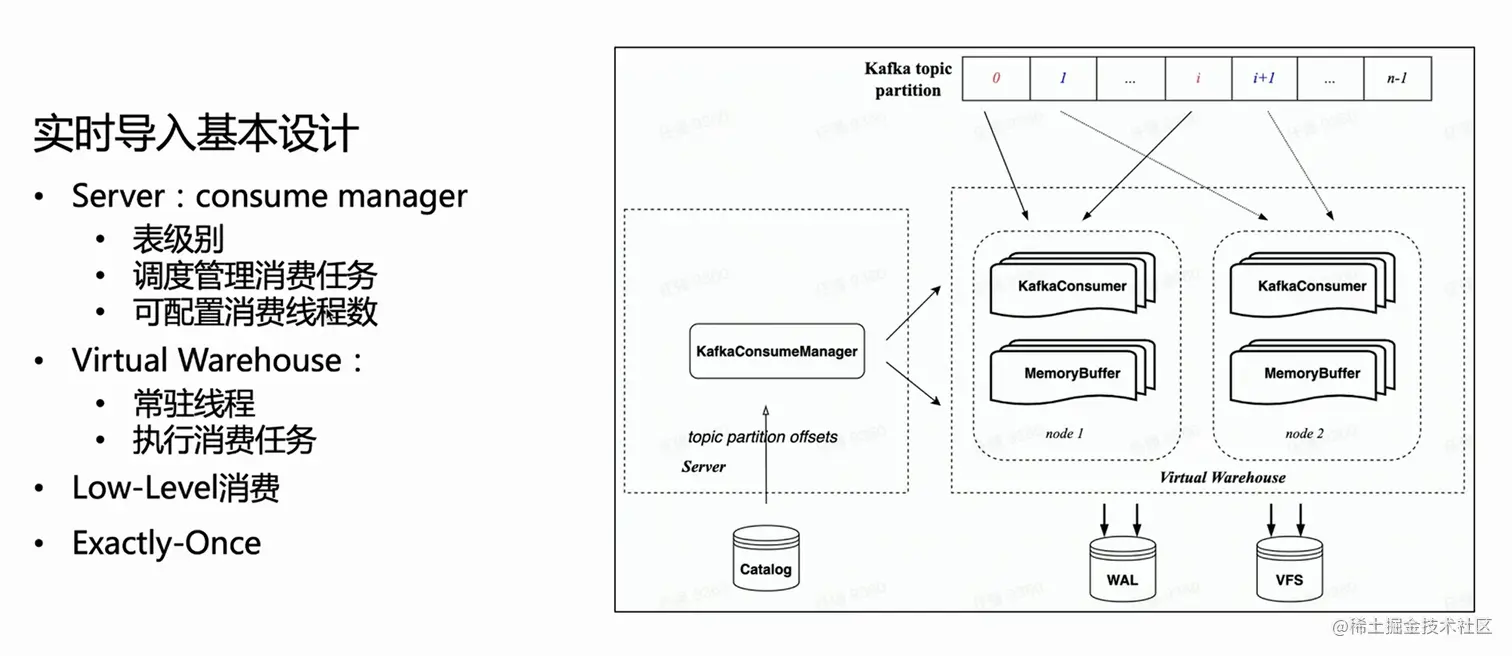 基于上图,大家可以看到左边是 Manager ,从 catalog 拿到对应的 Offset,然后根据指定的消费任务数目,来分配对应的消费 Partition、并调度到 Virtual Warehouse 的不同节点来执行。
