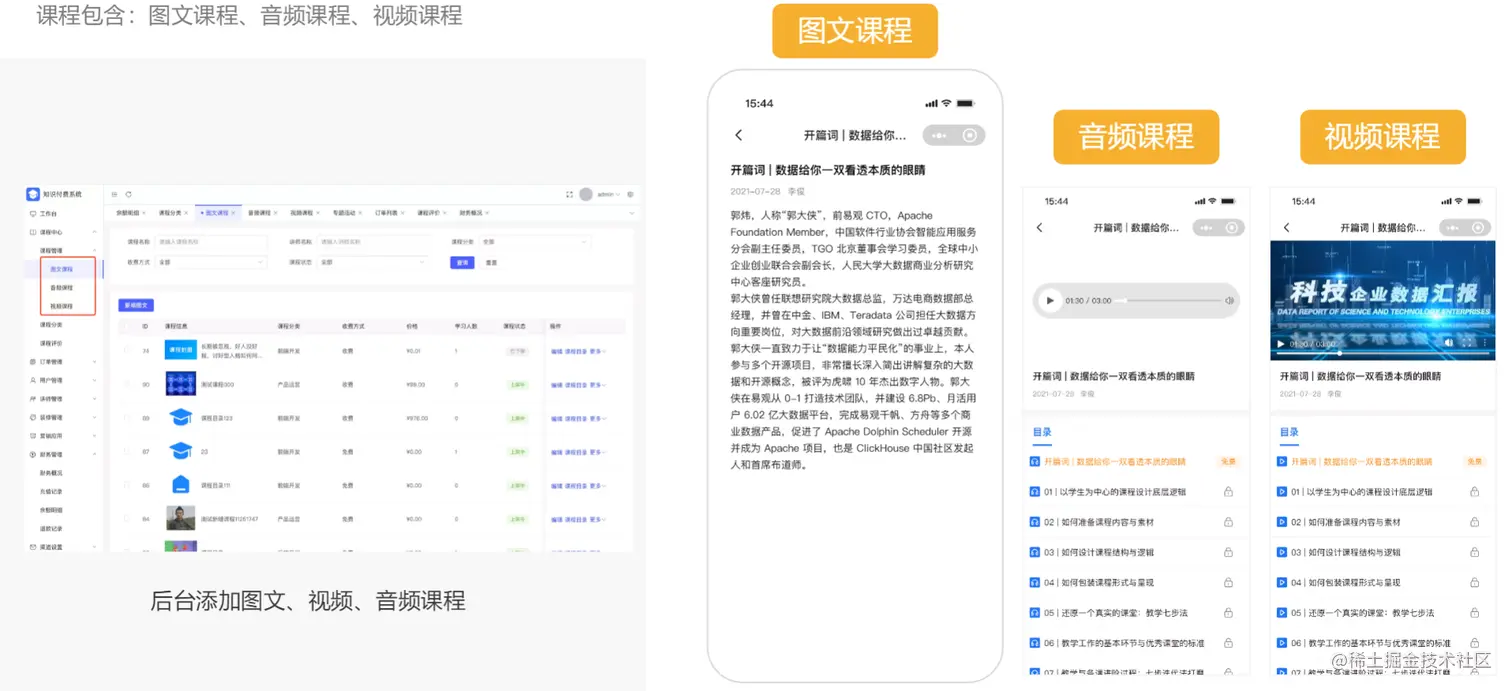 课程包含:图文课程、音频课程、视频课程