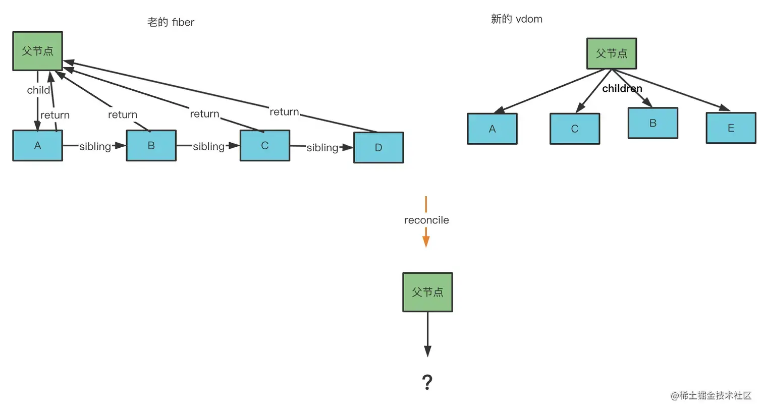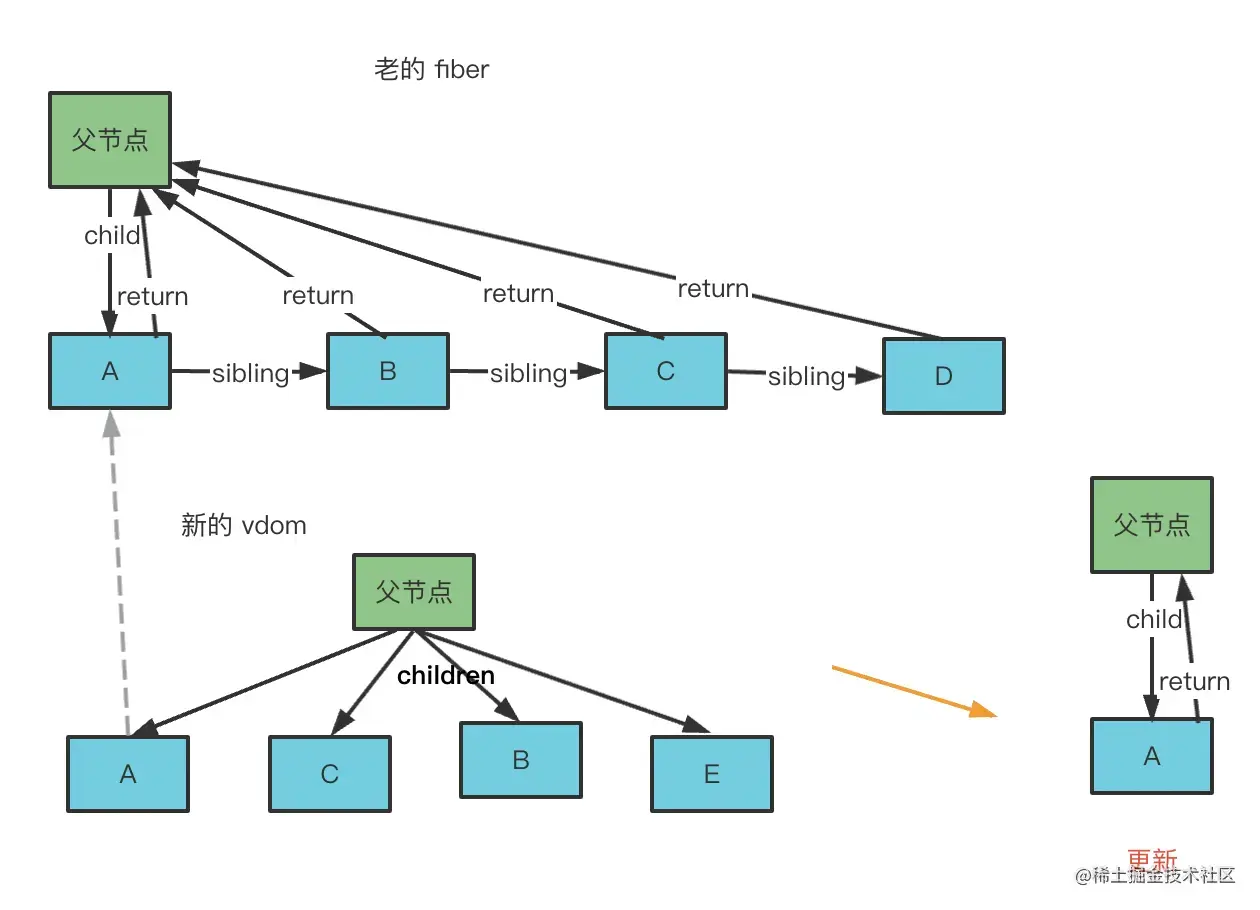 这样就实现了更新时的 reconcile,也就是上面的 diff 算法。其实核心就是找到可复用的节点,剩下的旧节点删掉,新节点新增。这样就完成了新的 fiber 结构的创建,也就是 reconcile 的过程。