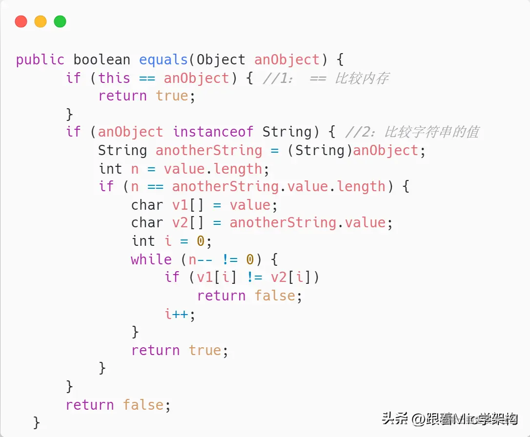 - 用==号比较两个对象的内存地址,如果地址相同则返回true