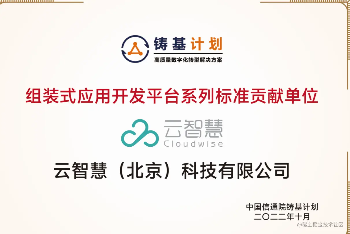 为让企业支持快速、安全和高效应用变化的技术架构,中国信通院联合云智慧以及百度智能云、腾讯云微搭低代码、中国工商银行、中国农业银行等二十余家数字化转型解决方案相关企业及研究机构制定了《组装式应用开发平台系列标准》