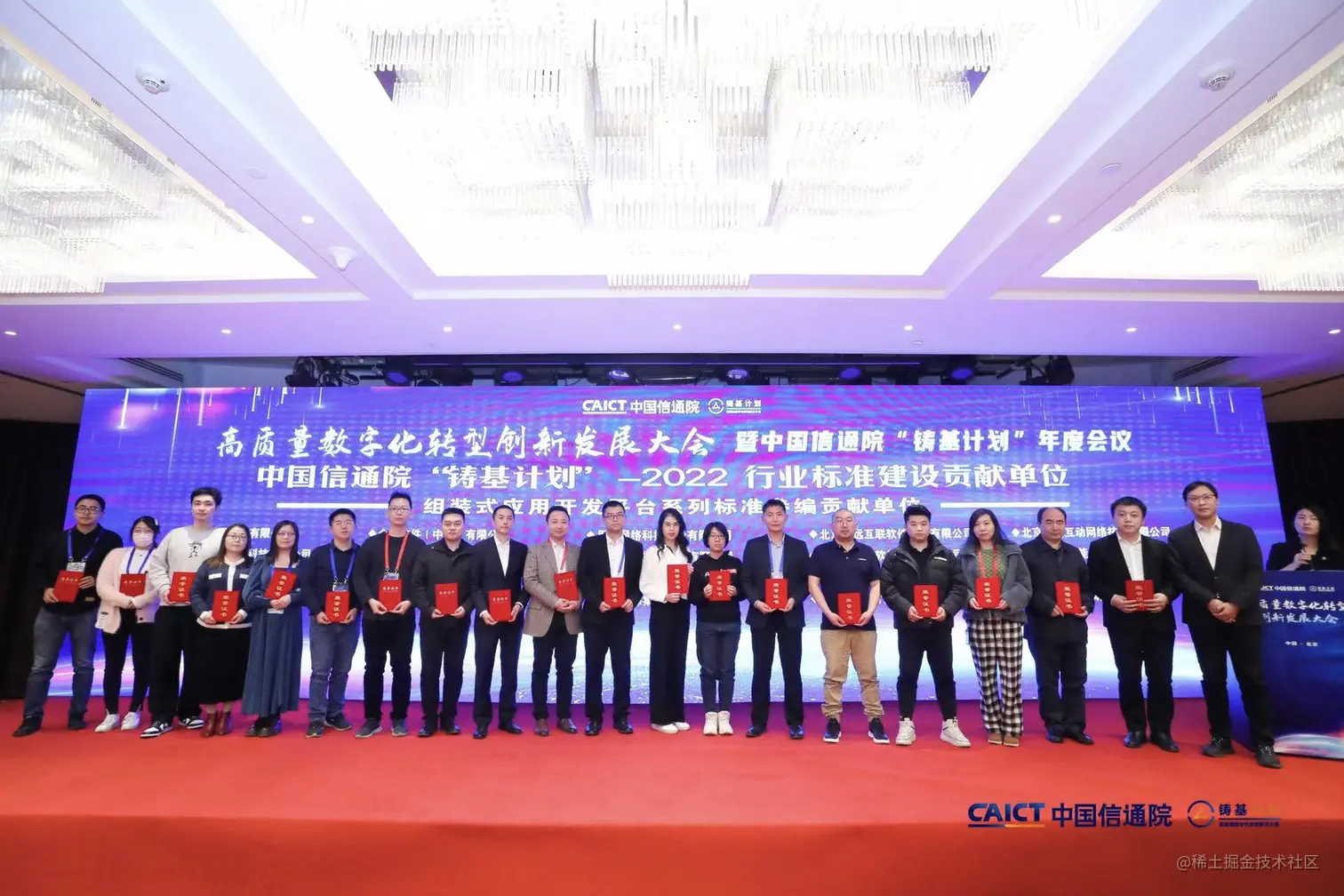 大会中,中国信通院泰尔终端实验室数字生态发展部主任王景尧博士为“铸基计划”2022年度标准建设贡献单位及年度评测产品企业代表颁发了证书。云智慧数据可视化与低代码专家王海虎(右数第五位)代表云智慧接受颁奖。