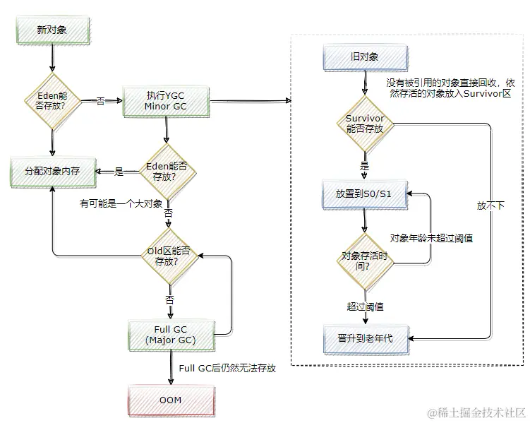 - 绝大部分的对象被创建之后,会保存在Eden区,当Eden区满了的时候,就会触发YGC(Young GC),大部分对象会被回收掉,如果还有活着的对象,就拷贝到Survivor0,这时Eden区被清空。