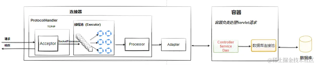 Executor 就是线程池,负责运行 SocketProcessor 任务类, SocketProcessor 的 run 方法会调用 Http11Processor 来读取和解析请求数据。我们知道, Http11Processor 是应用层协议的封装,它会调用容器获得响应,再把响应通过 Channel 写出。