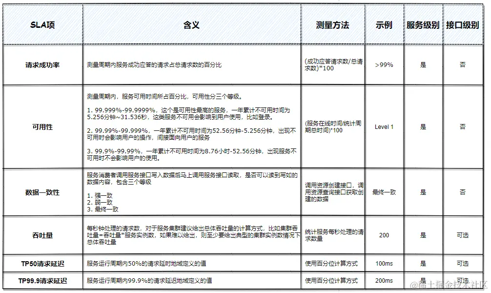 SLA:Service-Level Agreement的缩写,意思是服务等级协议。服务的SLA是服务提供者对服务消费者的正式承诺,是衡量服务能力等级的关键项。服务SLA中定义的项必须是可测量的,有明确的测量方法。