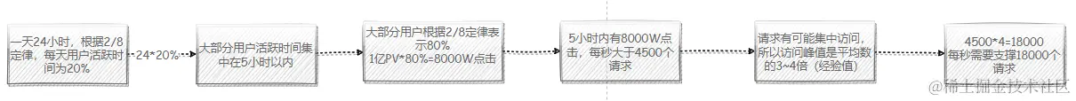 - 一天是24小时,根据2/8法则,每天大部分用户活跃的时间点集中在(24*0.2) 约等于5个小时以内,而大部分用户指的是(1亿点击 * 80%)约等于8000W(PV), 意味着在5个小时以内,大概会有8000W点击进来,也就是每秒大约有4500(8000W/5小时)个请求。