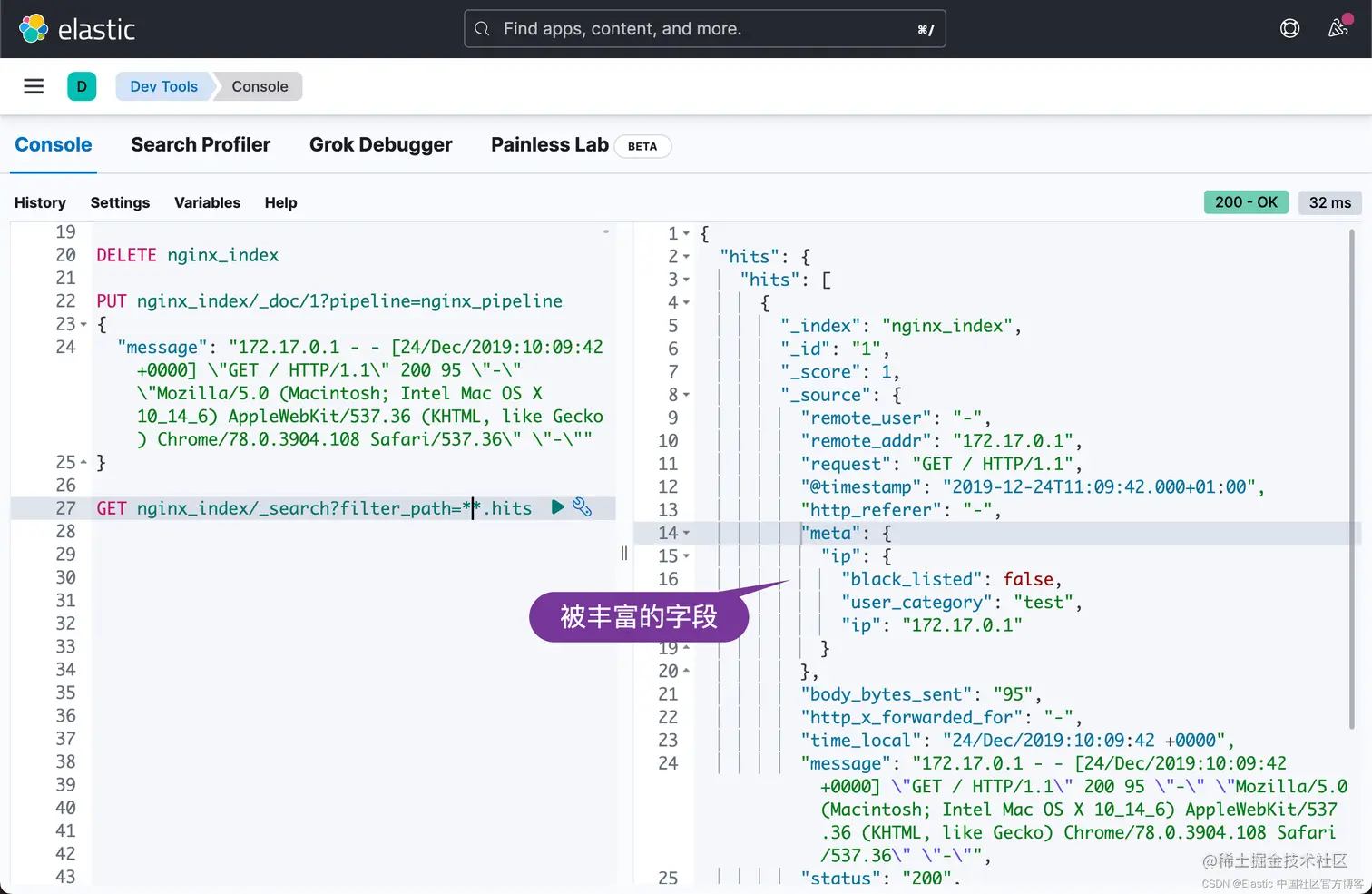 现在只需(重新)索引之前的文档(使用相同的 nginx 日志行)并提取日志内容,然后从我们的 ip_source_index 索引中丰富。