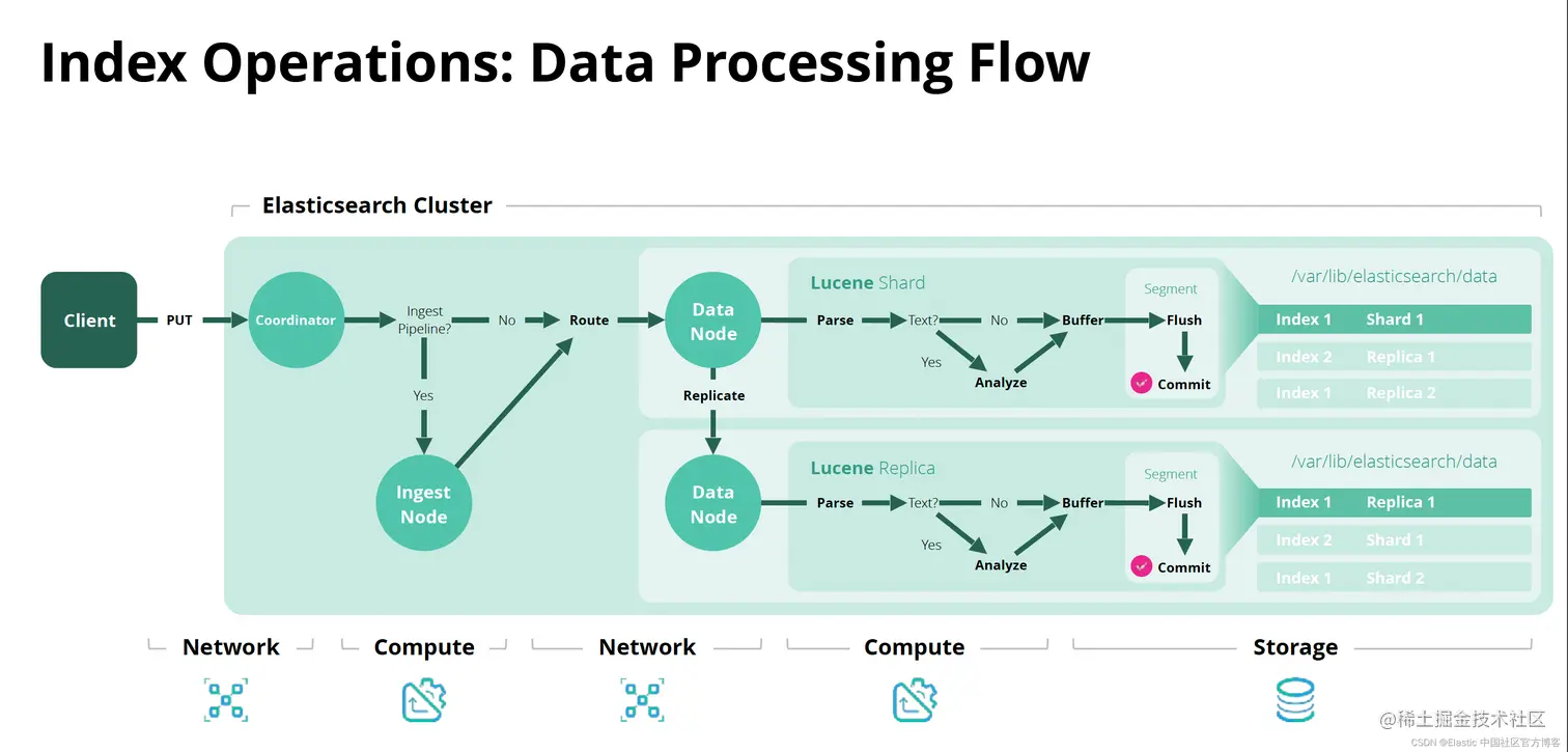 在索引操作期间,协调器节点收到请求后,就会立即在摄取节点上执行管道。 图片来源: elastic.co