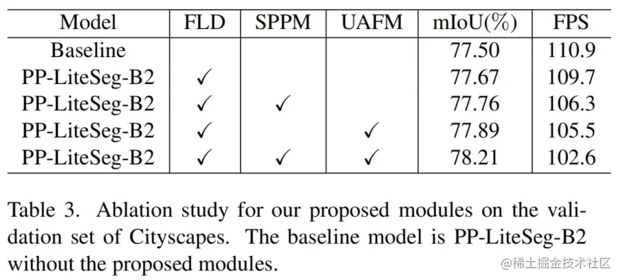 通过表3可以发现,PP-LiteSeg-B2中的FLD使mIoU提高了0.17%。添加SPPM和UAFM也提高了分割精度,而推理速度略有降低。基于提出的3个模块,PP-LiteSeg-B2以102.6FPS速度达到78.21mIoU。mIoU与Baseline模型相比提高了0.71%。