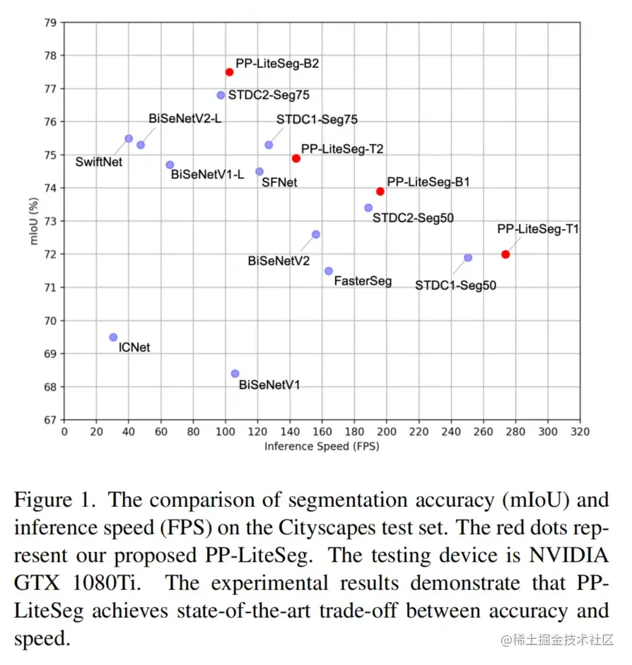 具体来说,PP-LiteSeg在Cityscapes测试集上达到了72.0%的mIoU/273.6FPS和77.5%的mIoU/102.6FPS。