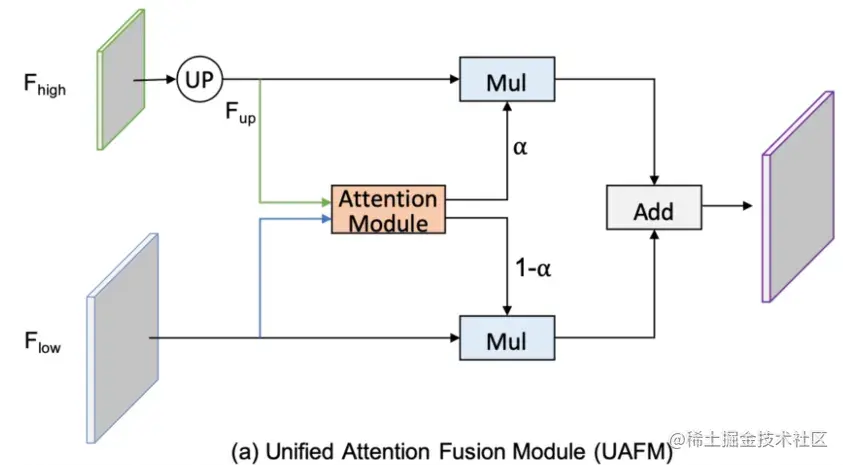 最后,UAFM对注意力加权后的特征进行element-wise Add,并输出融合特征。这里将把上述过程表述为公式1: