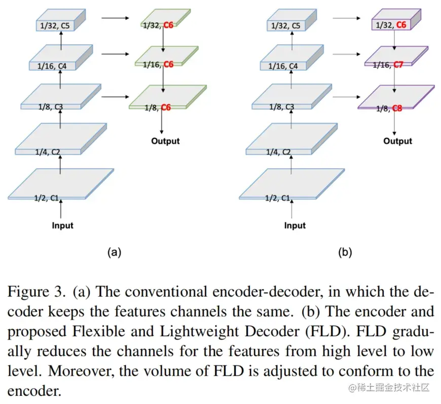 而最近轻量级语义分割模型的解码模块中,特征通道数都保持相同。因此,本文提出了一个更为灵活的轻量级解码器(FLD),它逐渐减少了通道数量,增加了特征的空间大小。此外,所提出的解码器可以很容易地根据编码器进行调整。灵活的设计平衡了编码器和解码器的计算复杂度,使整个模型的计算效率得到了提升。