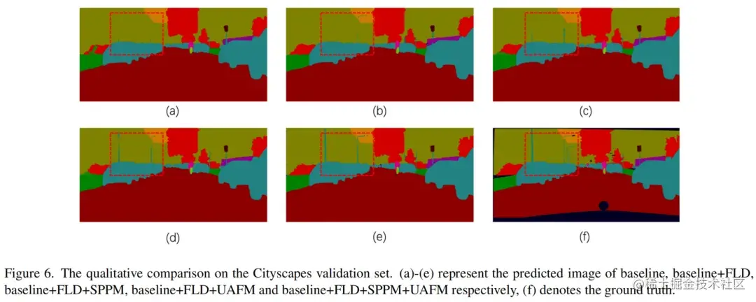 图6提供了定性的比较。可以观察到,当逐个添加FLD、SPPM和UAFM时,预测的图像更符合GT。总之,本文提出的模块对于语义分割是有效的。