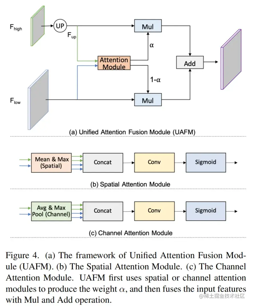 如上所述,融合多层次特征是实现高分割精度的关键。除了element-wise summation和concatenation方法外,研究人员还提出了几种方法,如SFNet、FaPN和AttaNet。在这项工作中提出了一个统一的注意力融合模块(UAFM),它应用通道和空间注意力来丰富融合特征表示。
