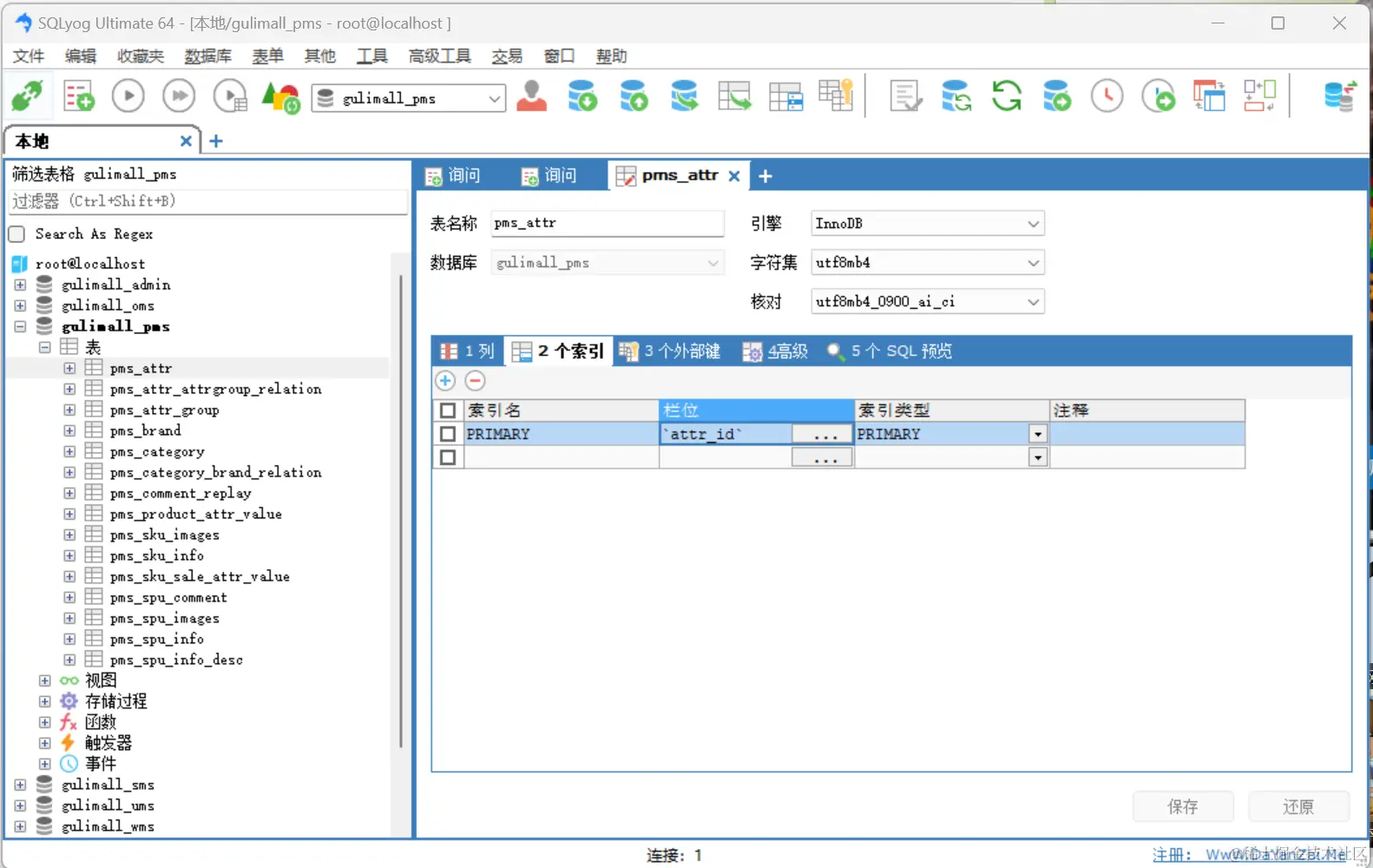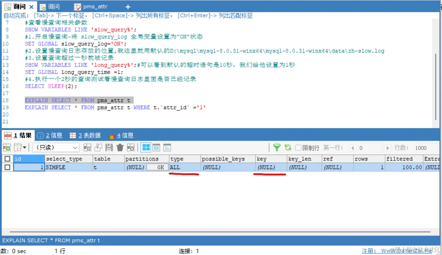 pms_attr这张表里面有一个索引 attr_id 我们通过explain来查看是否走了索引。